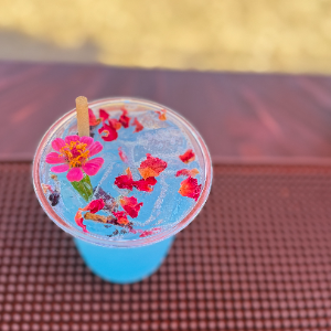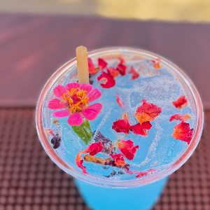 Fresh lime juice, pineapple, coconut water, blue spirulina. Garnished with coconut flake & rose petal.