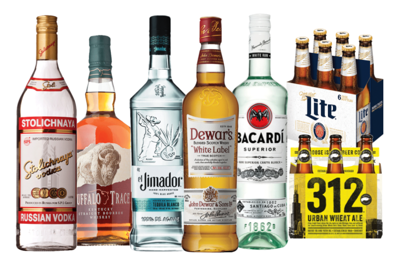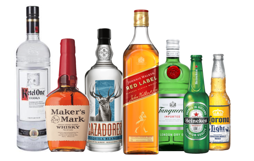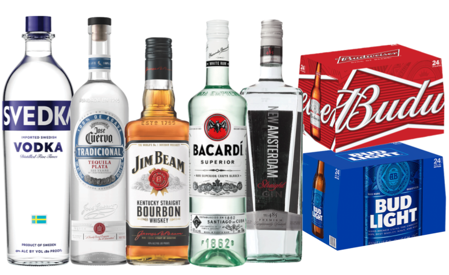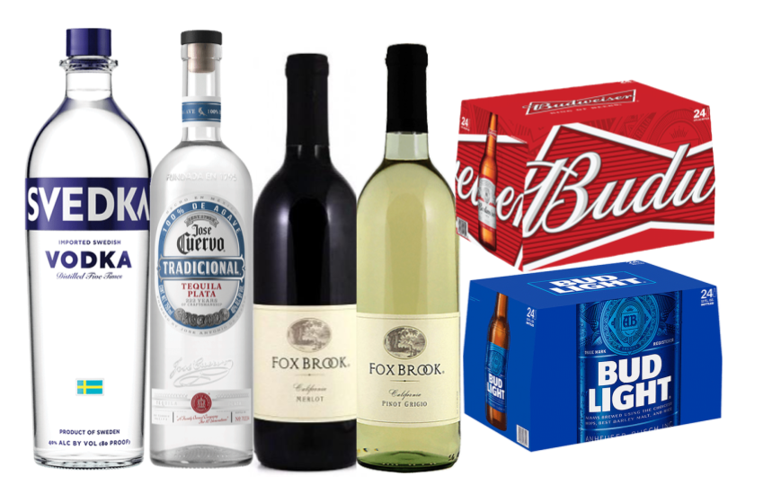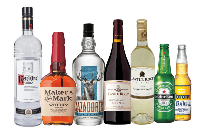 Includes standard vodka, gin, tequila, rum & whiskey, 2 reds & 1 white wine, 3 standard beer selections, sodas, juices, ice bottled water, beverage napkins, straws, & quality 9-oz clear recyclable cups
