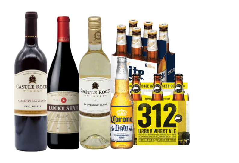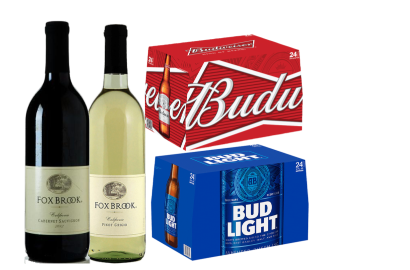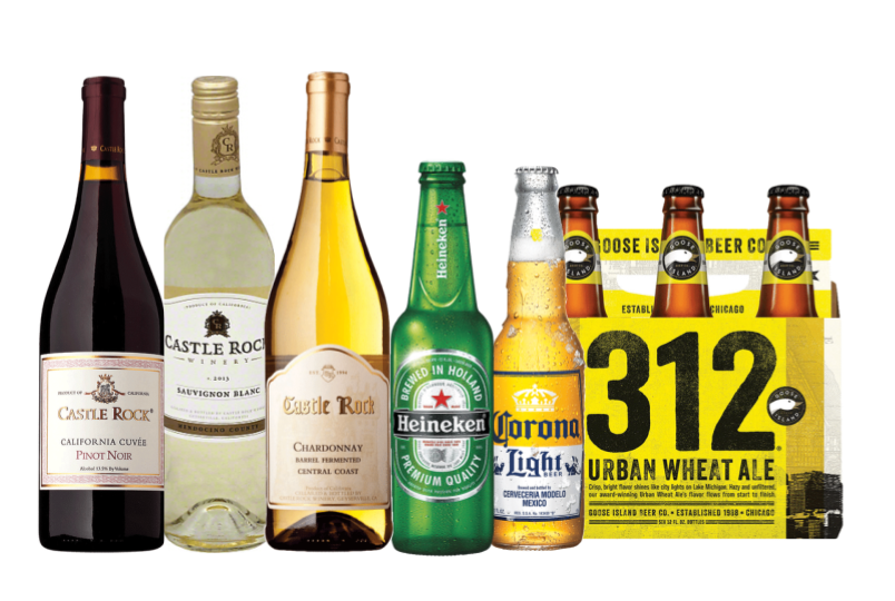 Includes 3 premium wine selections, 3 premium beer selections, sodas, juices, ice, bottled water, beverage napkins, straws, & quality 9oz clear recyclable cups.