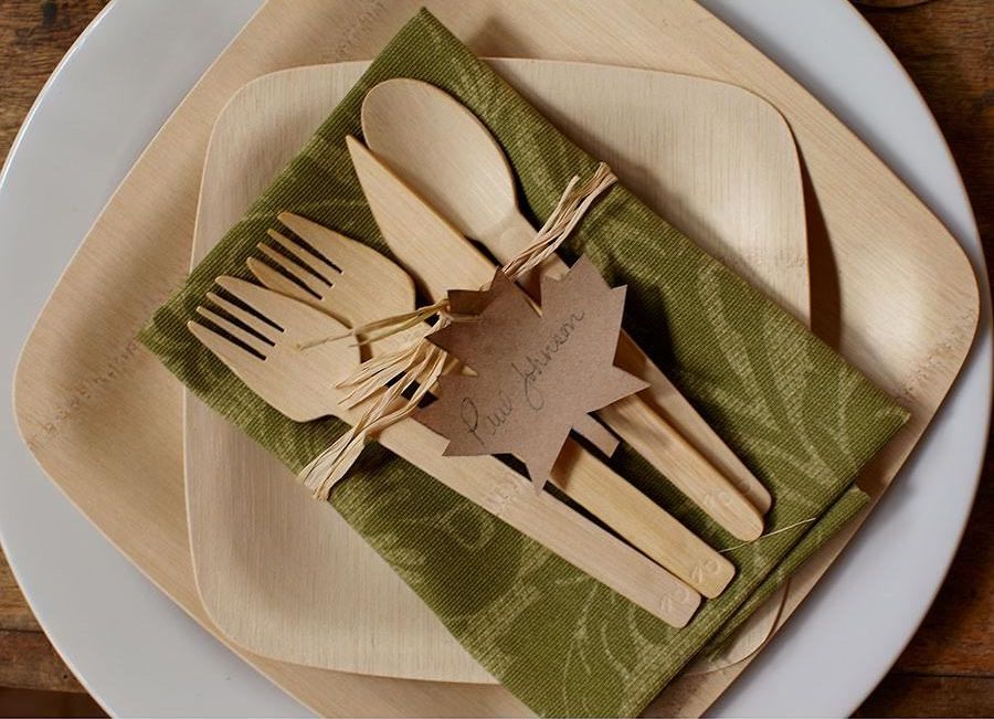 More & more couples are choosing to throw laid-back weddings and save a ton by using eco-friendly birch disposables over china & rented cutlery. This package is the average price per person you should budget for a DIY eco disposable place setting.