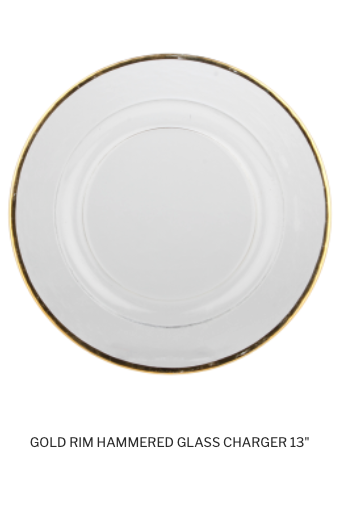 Delicately hammered glass charger with a gold band that adds an understated, fresh look to your table.
