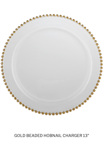 Delicate gold beading along the rim makes this glass charger plate a glamorous, glimmering accent for any table.