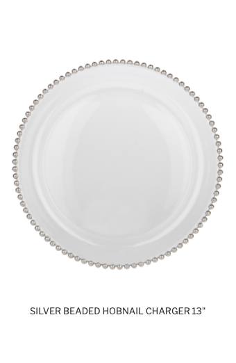 Delicate silver beading along the rim makes this glass charger plate a glamorous, glimmering accent for any table.