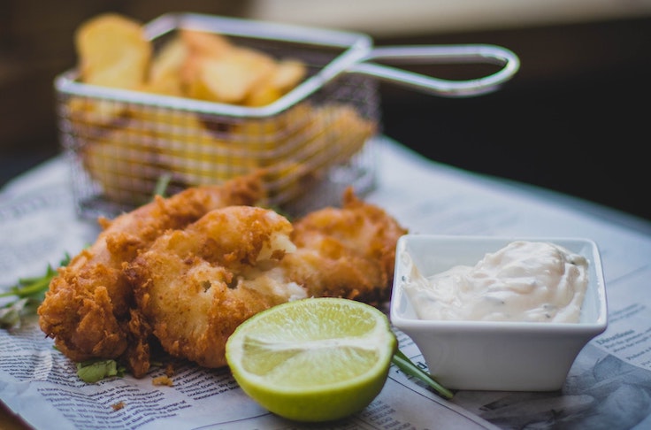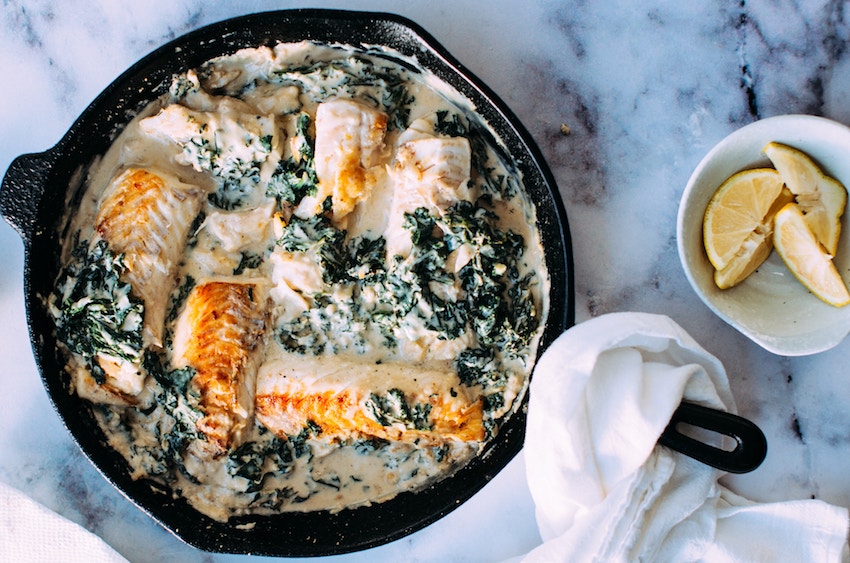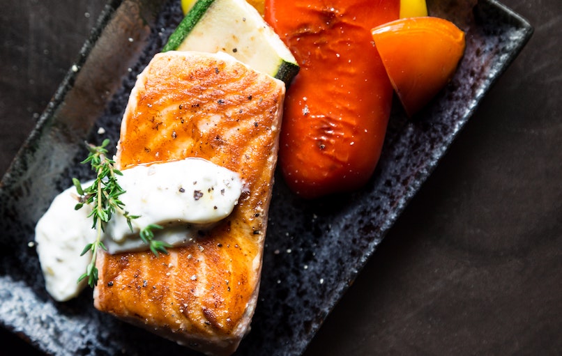beautifully decorated with cucumber scales, served with cucumber dill sauce