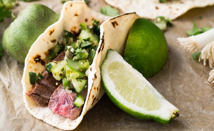 beef, chicken, & grilled veggie tacos w/ shredded cheese, lettuce & homemade salsa in a flour tortilla