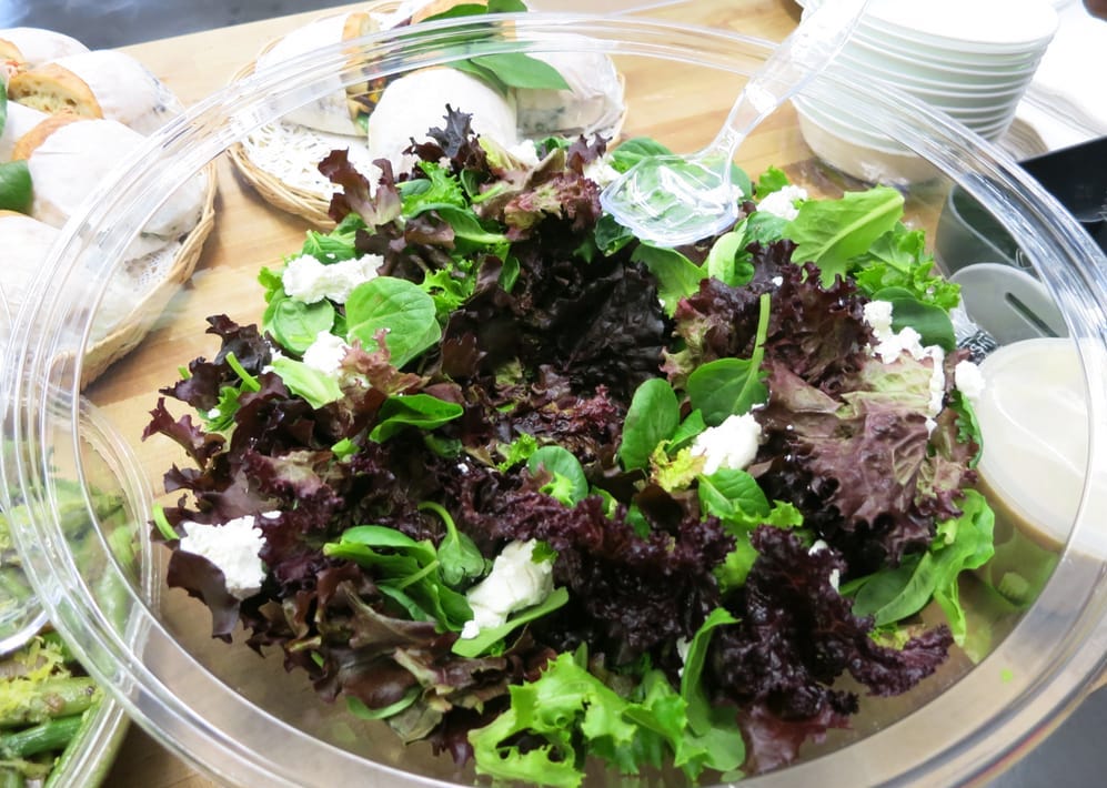 with mixed greens, strawberries, mint, goat cheese, and vinaigrette