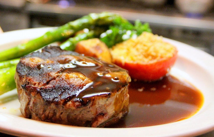 studded with caramelized pearl onions and mushrooms, brandy, Madeira and red wine