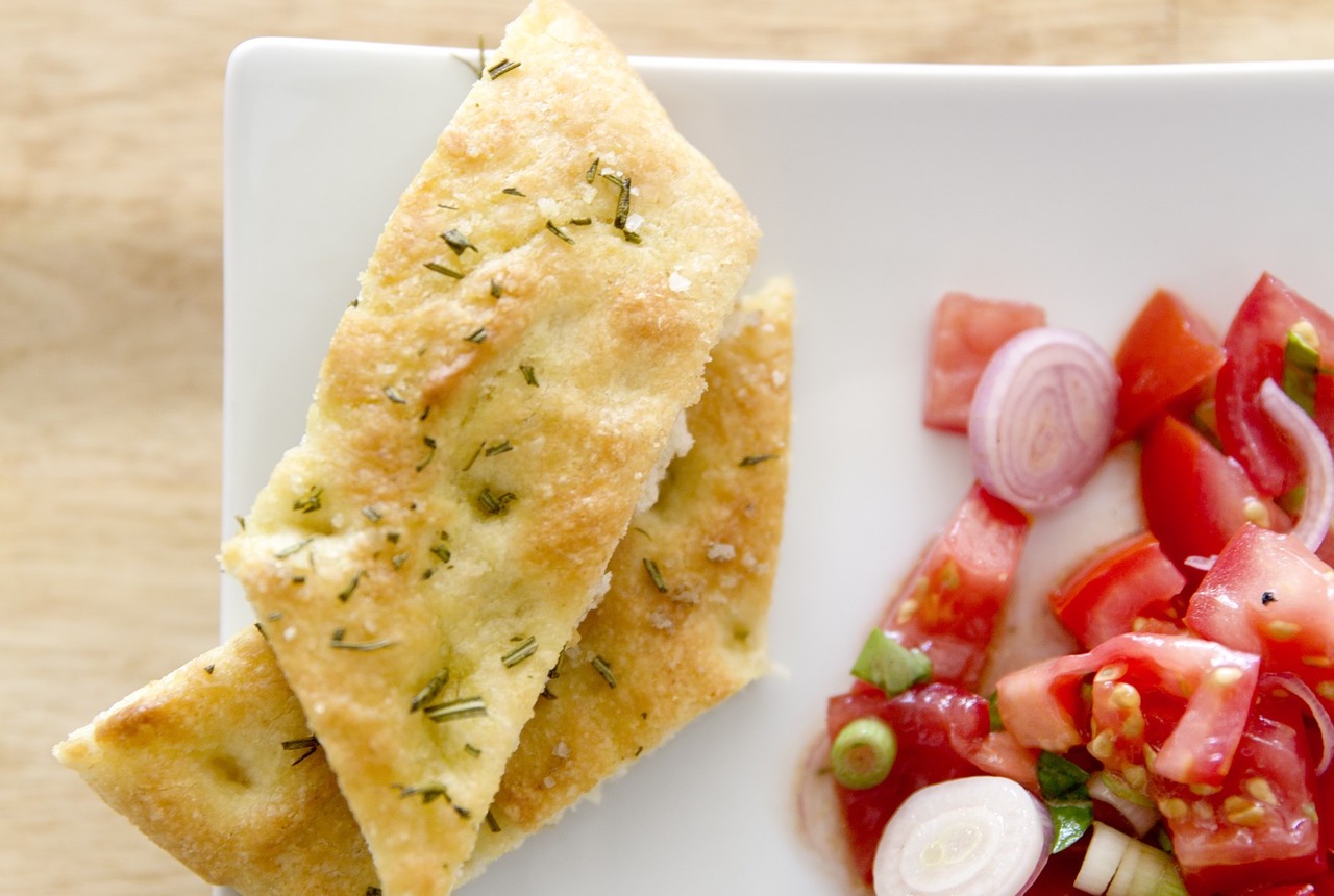 focaccia with goat cheese, scallions, garlic, and fresh herbs