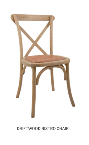 Driftwood is a beautiful, soft color that brings an elegant appearance to our Bistro Chair. Bistro chairs have contoured, steam-bent "X" backs, tapered legs and handwoven rattan seats that add texture and charm. These chairs provide a "country" feel without compromising on modernity. Available in a variety of colors to meet your unique decor.